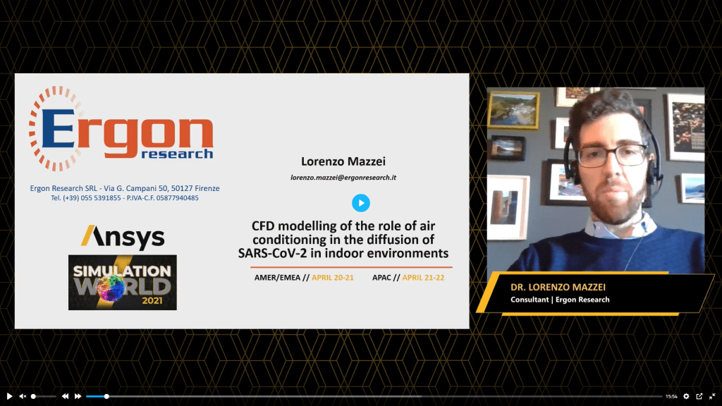 In the context of the latest ANSYS Simulation World I had the privilege to be invited to speak about our work carried out about on the use of CFD to fight the diffusion of Covid-19. The presentation was entitled “CFD modelling of the role of air conditioning in the diffusion of Sars-CoV-2 in indoor environments” and presented the results of the work carried out in 2020 with the Ospedale Pediatrico Bambino Gesù and SIMA.